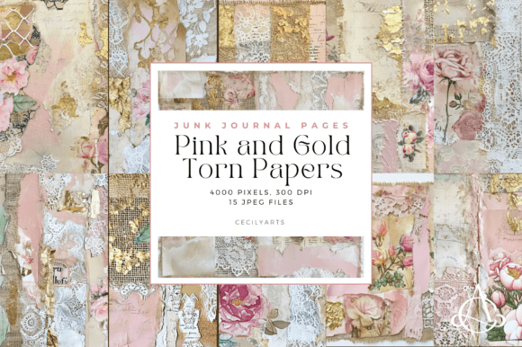 I love using this kit to add a touch of “decayed luxury” to my projects. It features raw, deckled edges and distressed paper textures highlighted by shimmering metallic veins, making it a sophisticated addition to any pink junk journal.