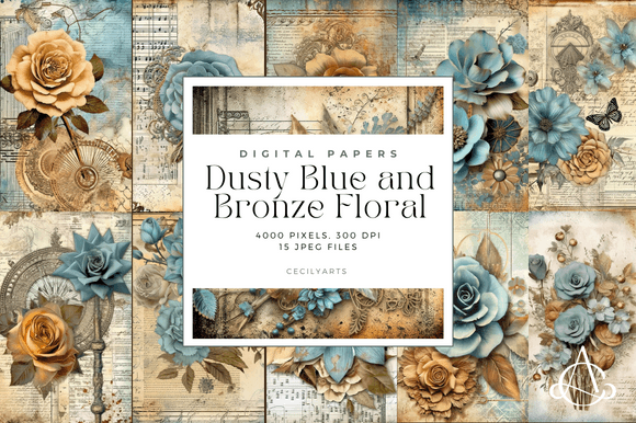 There’s a vintage industrial elegance here that I just can’t get enough of. The bronze tones add a “weathered metal” feel that grounds the soft blue blooms. I use this for a floral journal that needs a touch of Steampunk or aged masculinity. The metallic-look textures are a huge plus—they give the paper a heavy, expensive feel.