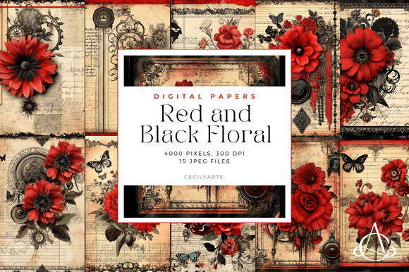 This bold combo is perfect for a gothic-themed floral journal. I love using it for dramatic covers or intense, romantic layouts. The contrast is sharp and moody, making red roses pop against the dark background. It’s my go-to when I want a page that feels passionate and mysterious without needing extra layers.